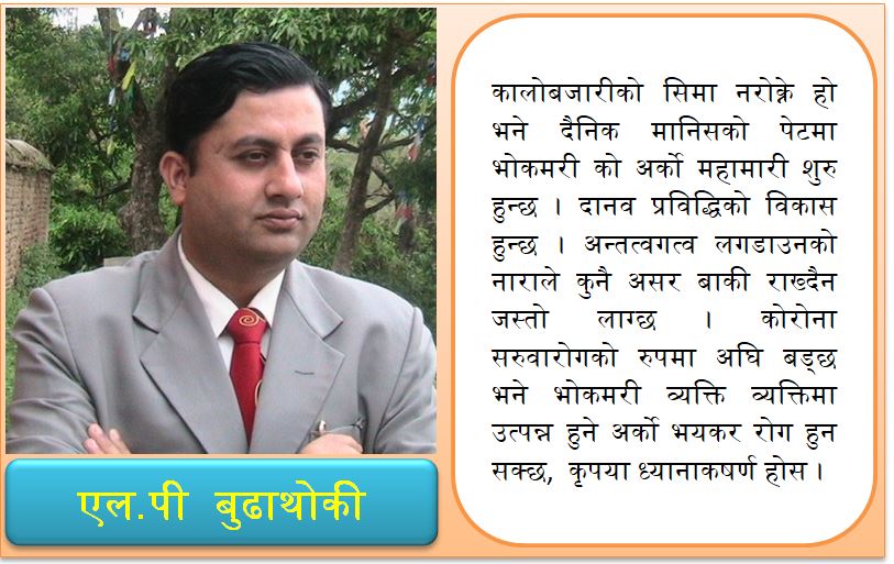 वडा स्तरमा प्रतिनिधि तथा राजनैतिक तथा सामाजिक व्यक्तिहरु पनि प्रहरीका रुपमा राज्य सँग सहकार्य गरुन भने भनि गरिव दुःखीको आवाज सुन्न पाइन्छ । प्रधानमन्त्री ज्यू तथा मन्त्रिमण्डल सबैमा अनुरोध गर्न चाहन्छौ कि तपाईका राज्यका सबै कार्यहरु सक्रिय हुन जरुरी छ । मानव समुदायमा केवल म र मेरो भलाई भनि कालोबजारीको सिमा नरोक्ने हो भने दैनिक मानिसको पेटमा भोकमरी को अर्को महामारी शुरु हुन्छ । दानव प्रविद्धिको विकास हुन्छ । अन्तत्वगत्व लगडाउनको नाराले कुनै असर बाकी राख्दैन जस्तो लाग्छ । कोरोना सरुवारोगको रुपमा अघि बड्छ भने भोकमरी व्यक्ति व्यक्तिमा उत्पन्न हुने अर्को भयकर रोग हुन सक्छ, कृपया ध्यानाकषर्ण होस ।