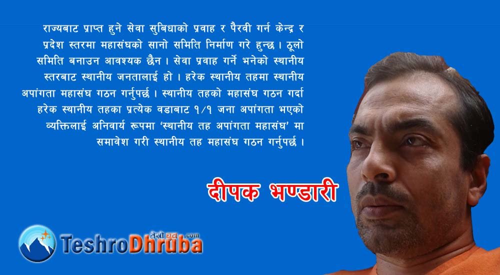 आज देशमा संघीय राज्य प्रणाली स्थानीय, प्रदेश र केन्द्रीय तह छन् । अपांगता महासंघ पनि तीन तहमा गठन हुनुपर्छ । सबैले यो कुरामा ध्यान दिएर स्थानीय तहमा स्थानीय स्तरको अपांगता महासंघ निर्माण गर्न आवश्यक छ । आजसम्म सेवा सुबिधा टोलस्तरमा रहेका अपांगता भएका व्यक्तिहरुसम्म नपुग्नुको कारण यही स्थानीय स्तरमा अपांगता महासंघ नभएर नै हो । प्रदेश र केन्द्रसम्म धेरै जसो अपांगता भएका व्यक्तिहरूको पहुँच हुँदैन । फलस्वरूप त्यो व्यक्ति राज्यबाट पाउने सेवा सुबिधा र अवसर पाउनबाट वञ्चित भइरहेको हुन्छ ।
