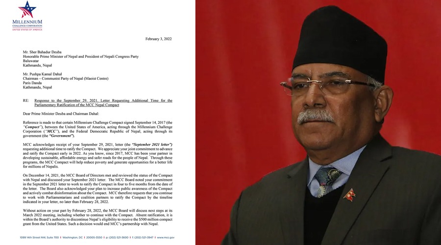 अमेरिकी सहयोग परियोजना एमसीसी पारित हुनु हुँदैन भनेर अडान लिइरहेका प्रचण्डले आफैं एमसीसीलाई पास गर्ने पत्र लेखेको सार्वजनिक भएपछि उनको दोहोरो चरित्र छरपष्ट भएको छ । चार महिनाअघि दुवै नेताले एमसीसी बोर्डलाई पठाएको पत्रमा संसदबाट एमसीसी अनुमोदन गर्ने प्रतिबद्धता जनाइएको छ ।