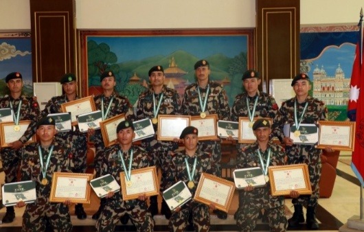 प्रधानसेनापति प्रभुराम शर्माले सैनिक मुख्यालय जङ्गी अड्डामा आयोजित समारोहमा प्रतियोगितामा स्वर्ण पदक विजेता नेपाली टोलीमा सहभागी अधिकृत, पदिक र अन्य दर्जालाई ‘प्रधान सेनापति प्रशंसा पदक’ प्रदान गरे ।