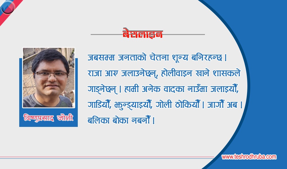 हजारौँ जनताको बलिदानले आएको उपलब्धिलाई आज गणतन्त्रमा एकाध पात्रको भ्रष्टता र असक्षमतालाई हेरि व्यवस्था ठीक भएन भन्ने बेला आइसकेको छैन । समस्या पात्रको हो, प्रणालीको हैन । राष्ट्रवादलाई खोप अनि धर्मको राजनीतिलाई बुस्टर डोज भनेर प्रचार गर्ने दक्षिणपन्थीहरू यदि आउँदो निर्वाचनहरूमा घर दैलोमा आए भने प्रश्न गरौँ कि…