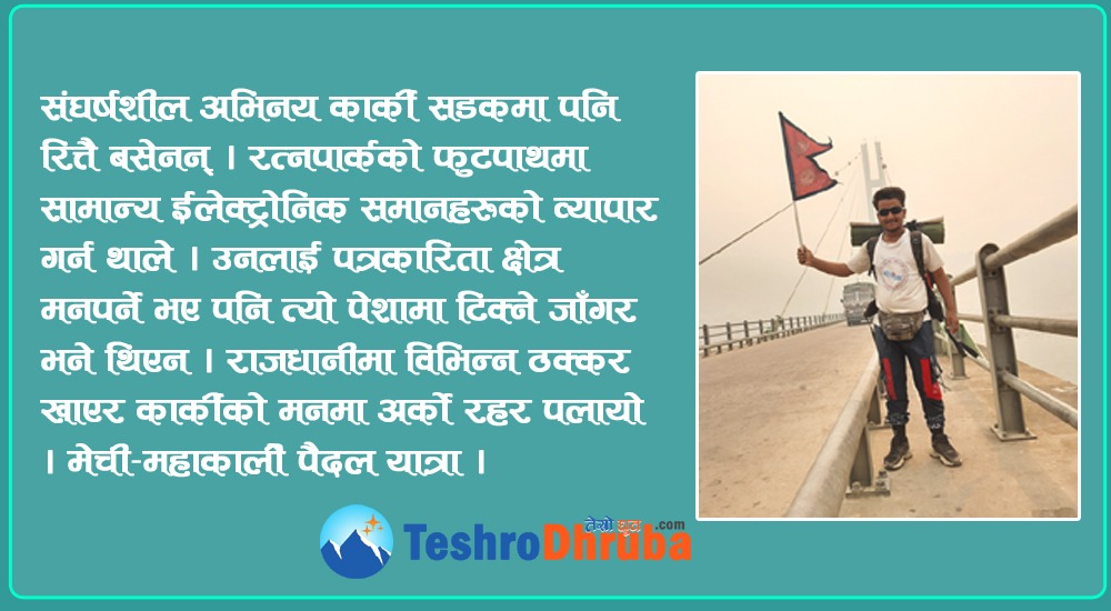 महेन्द्रनगर । अनुहारै छोपिनेगरी घाँटीभरी खादा । गहुँगोरो अनुहार पनि रताम्य भएको । न धेरै अग्लो, न होचो नै । ठीकैको जीउडाल । वरिपरि सेल्फी खिच्नेको ताँती । उनी थिए साइकल यात्री अभिनय कार्की ।