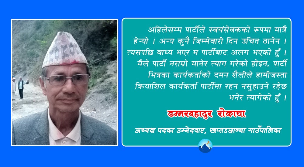 आगामी ३० गते हुने निर्वाचनका लागि पनि नेपाली कांग्रेसले खप्तडछान्ना गाउँपालिकाको अध्यक्ष पदका लागि रोकाया सहित ११ जनाको नाम पनि सिफारिस गरेको थियो । आकांक्षी धेरै भए पनि रोकायाको नाम अन्तिम तीन जनाभित्र परेको थियो । मध्येराति पार्टीले एकल निर्णय गर्दै रोकायाको नाम हटाएर फरक व्यक्तिलाई टिकट दिएपछि उनले स्वतन्त्र उम्मेदवारी दर्ता गरे । तिनै खप्तडछान्ना गाउँपालिकाको स्वतन्त्र उम्मेदवार डम्मरबहादुर रोकायासँग तेस्रो ध्रुव डटकमले गरेको कुराकानीको सम्पादित अंश :