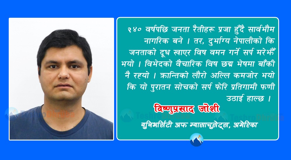 सबै जनता सहरमा लौरो (रुखको हाँगा), कलम लिएर र जंगलमा हँसिया-हतौडा, बन्दुक लिएर बल्ल बल्ल यो मत्ता हात्ती नियन्त्रण गरे । २४० वर्षपछि जनता रैतीहरू प्रजा हुँदै सार्वभौम नागरिक बने । तर, दुर्भाग्य नेपालीको कि जनताको दूध खाएर विष वमन गर्ने सर्प मरेझैँ भयो । विभेदको वैचारिक विष छद्म भेषमा बाँकी नै रह्यो । क्रान्तिको लौरो अल्लि कमजोर भयो कि यो पुरातन सोचको सर्प फेरी प्रतिगामी फणी उठाई हाल्छ । अब यो जडसुत्रवादी पुरातन सोचको हरेली सर्प यो साझा फूलबारीको घाँसमा यसरी लुकेर बसेको छ कि चिन्न नै मुस्किल छ । घाँस भनेर हातले समाए डस्न सक्छ ।