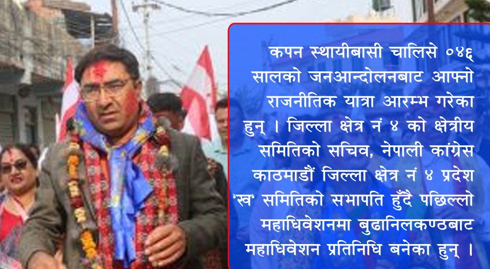 काठमाडौं । काठमाडौंको बुढानिलकण्ठ नगरपालिकामा नेपाली कांग्रेसका मेयर पदका उम्मेदवार बनेका विनोद चालिसे स्थानीय स्तरमा समाजसेवीको रूपमा परिचय बनाएका व्यक्ति हुन् ।