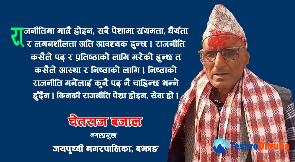 काठमाडौं । ‘प्रलोभनमा परेर आस्थाको राजनीति मास्नु हुँदैन, निष्ठाको राजनीति स्थापित गर्नुपर्छ’ भन्दै सभा तथा मञ्चहरूमा कुर्लने एक किशोर अहिले जीवनको उत्तरार्द्धमा प्रवेश गरिसकेको छ । बुढ्यौलीसँगै तेजिलो आवाज पनि विस्तारै पातलिँदै गएको छ । सरल तथा इमानदार स्वभाव जस्ताको त्यस्तै छ । तर, पार्टीको सिद्धान्त र पार्टीका प्रेणतालाई भने कहिल्यै बिर्सेको छैन । चेतराज बजाल ।