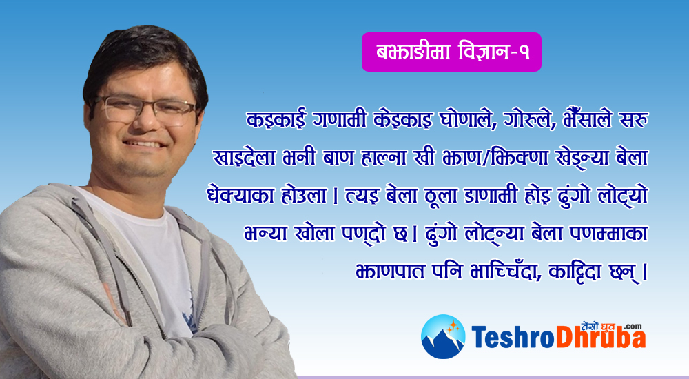 (मु हप्ता दिनको वा १५ दिनको यो स्तम्भबाट विज्ञानका अवधारणा गाउँघरको बझाङी भाषामा व्याख्या हन्र्याछु । हाउरा दिनका दिन हुन्या काम (क्रियाकलाप)का पछाडि रह्याका वैज्ञानिक कारण र विधिहरूमाथि जानकारी दिँदै विद्यार्थी, शिक्षक र विज्ञानका पारखी सबुईखी नानु सिक्न्या मौका होइझाला रे ती वैज्ञानिक विधिलाई हाउरा बानीउणा उतारी गाउँघरउणाका असजी काम सजी बनाउन रे गाउँघरममा उद्यमशीलता (गरि खान्या बाटो) मा केही फाइदा होला भनीबन्ट स्तम्भ लेख्याको हो ।)