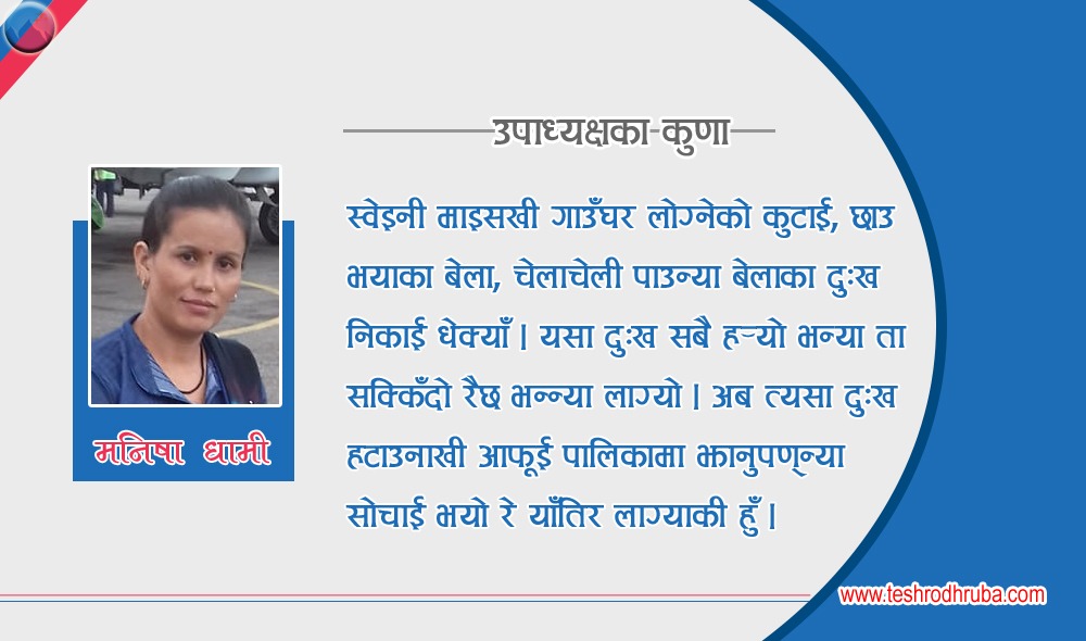 –मु राजनीतिमी ता नान्काई छन्जाँ आयाकी हुँ । पार्टीको काम हर नभन्यापछि आफ्नै काम हर्याँ । बेला बेलामा पार्टीले दियाको काम पनि हर्याँ । सबैको काम पनि गाउँघरमा भयापछि नहुन्या कुणोइ भयोइन । मुईले ९ वर्ष गरिबी निवारण कोषमा काम हर्याँ । त्यइ बेलामा पनि गाउँघर आइमाई दिदीबहिनीका सजिलाका लागि झिक्कै चुटी बोल्न्या, काम हर्न्या मौका मिल्यो । स्वेइनी माइसखी गाउँघर लोग्नेको कुटाई, छाउ भयाका बेला, चेलाचेली पाउन्या बेलाका दुःख निकाई धेक्याँ । यसा दुःख सबै हर्यो भन्या ता सक्किदो रैछ भन्न्या लाग्यो । अब त्यसा दुःख हटाउनाखी आफूई पालिकामा झानुपण्न्या सोचाई भयो रे याँतिर लाग्याकी हुँ ।