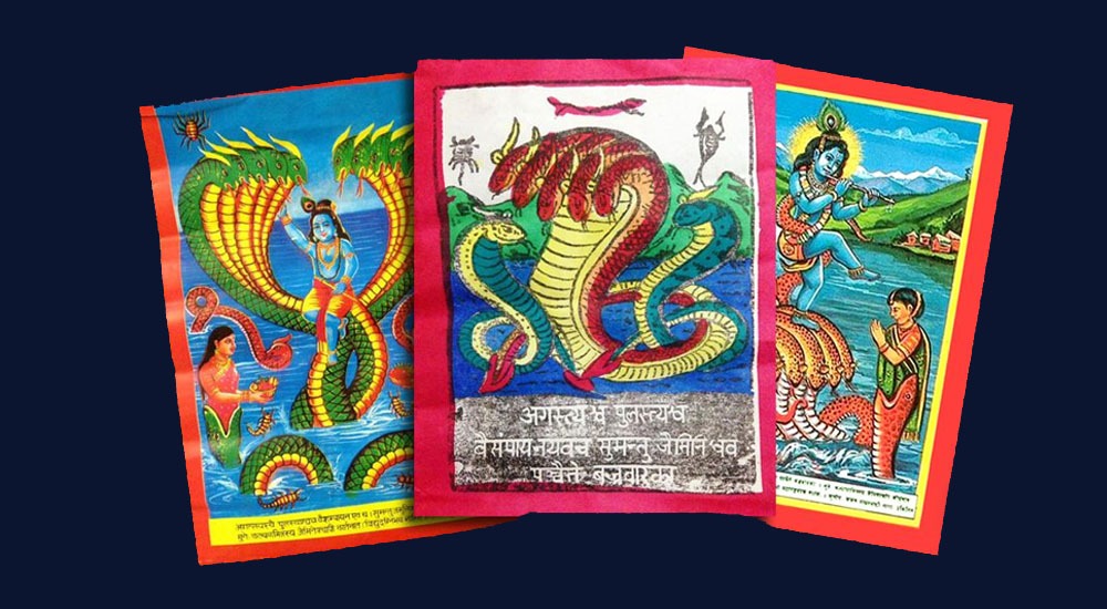 नागहरु जस्तै अनन्त, बासुकी, पद्म, महापद्म, तक्षक, कुली, कर्कट, शङ्खनाग, शेषनाग आदिको चित्र टाँसिन्छ । यसरी विभिन्न नागको चित्र घरमा टाँस्नाले चट्याङ्गले नहान्ने, आगो तथा सर्पको भय नहुने धार्मिक आस्था तथा विश्वास रहिआएको छ । श्रावण शुक्ल पञ्चमी तिथिका दिनदेखि वर्षायाम समाप्त भइ हिउँद सुरु भएको समेत मानिन्छ।