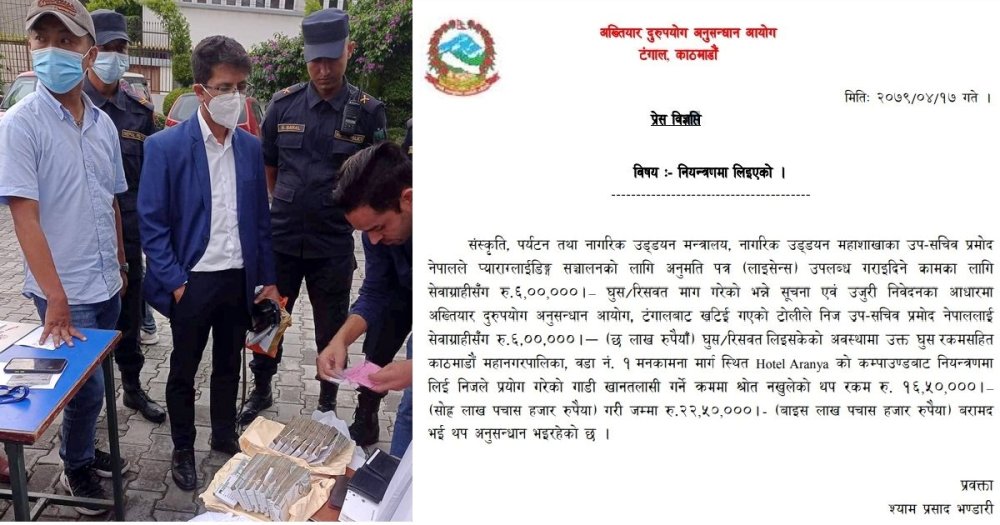 काठमाडौं । अख्तियार दुरुपयोग अनुसन्धान आयोगले संस्कृति पर्यटन तथा नागरिक उड्डयन मन्त्रालयका उपसचिव प्रमोद नेपाललाई घुस सहित रंगेहात पक्राउ गरेको छ ।