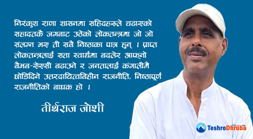 लोकतन्त्रमाथिको संकटलाई अनुभूत गर्न सक्ने आत्मिक क्षमता राजनीतिक वृतमा नभएको लक्षणहरु देखा परिरहेका छन् । महामानव स्व. विश्वेश्वरप्रसाद कोइरालाले भन्नुभएको थियो, ‘देशको परिस्थितिलाई ऐतिहासिक दृष्टिबाट विचार गर्ने शक्ति हामीमा भएन भने हामीले समस्याको यथार्थ ज्ञान पनि प्राप्त गर्न सक्ने छैनौ ।’ बीपीको यहीँ बाणी सच्चा लोकतन्त्रबादीका लागि मार्गदर्शक बन्न सक्छ । अन्यथा ऐतिहासिक दायित्वको बोध भएन भने निर्धो बन्नेछ लोकतन्त्र र निर्धा बन्ने छन् जनता । सम्बन्धित सबैलाई चेतना भया । अस्तु ।