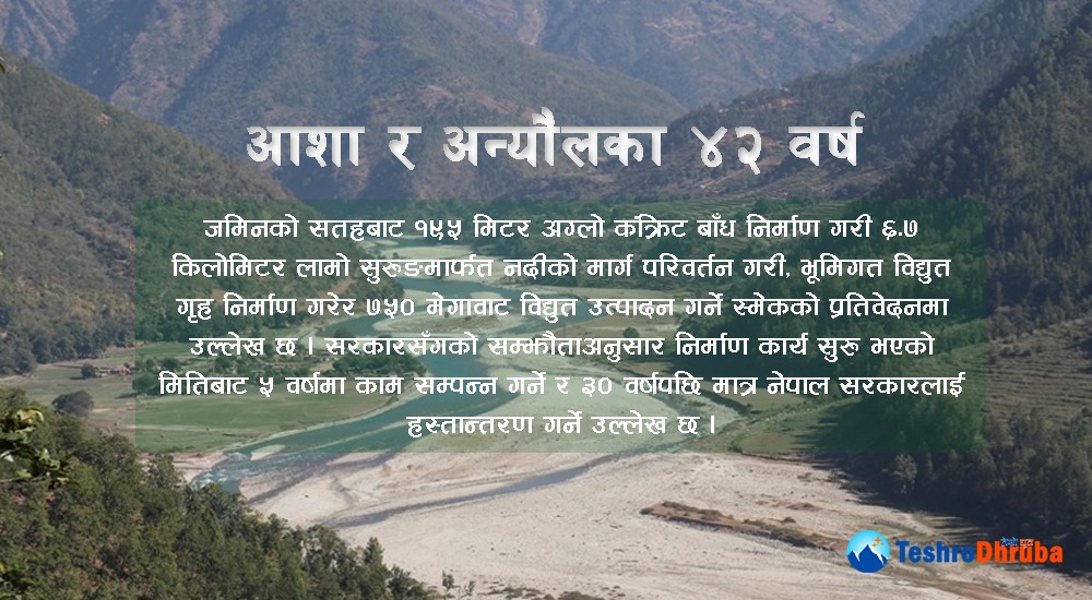 सन् १९८१ देखि चर्चा पाएको पश्चिम सेती परियोजना आजका मितिसम्म अनिश्चित छ । ‘निर्विकल्प’ निर्माण गर्ने भनेको सरकारले विभिन्न अन्तर्राष्ट्रिय कम्पनीसँग सम्झौता गर्दै एनएचपीसीसम्म आइपुगेको छ । ४२ वर्षअघि नेपाल र नेपालीको उज्ज्वल भविष्यको कल्पना गरिएको पश्चिम सेती परियोजना चुनावी एजेण्डा मात्रै बन्ने गरेको छ । पश्चिम सेतीका नाममा वर्षौंदेखि अँध्यारोमा बस्न बाध्य जनतालाई विकासका हरेक पूर्वाधार दूर भएका छन् ।