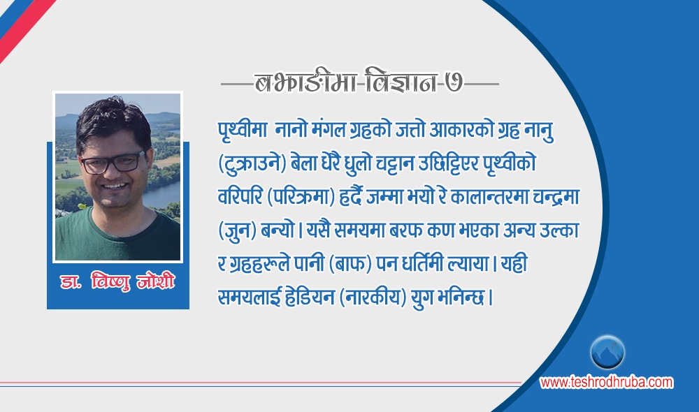 ४.५ अर्ब वर्ष पहिले पृथ्वी सौर्य मण्डलमा छरिएका धुल्कण संगठित भएर गोलाकार स्वरूप लियो । ४.५ अर्बदेखि ४ अर्बसम्म जीवनको सम्भावना छियैन प । तकतक ज्वालामुखी आई अत्यन्त उष्ण जल्दो नरक जसो वातावरण छियो । यै कालखण्डमी पृथ्वीमा अर्को नानो मंगल ग्रहको जत्तो आकारको ग्रह नानु (टुक्राउने) बेला धेरै धुलो चट्टान उछिट्टिएर पृथ्वीको वरिपरि (परिक्रमा) हर्दै जम्मा भयो रे कालान्तरमा चन्द्रमा (जुन) बन्यो । यसै समयमा बरफ कण भएका अन्य उल्का र ग्रहहरूले पानी (बाफ) पन धर्तिमी ल्याया । यही समयलाई हेडियन (नारकीय) युग भनिन्छ ।