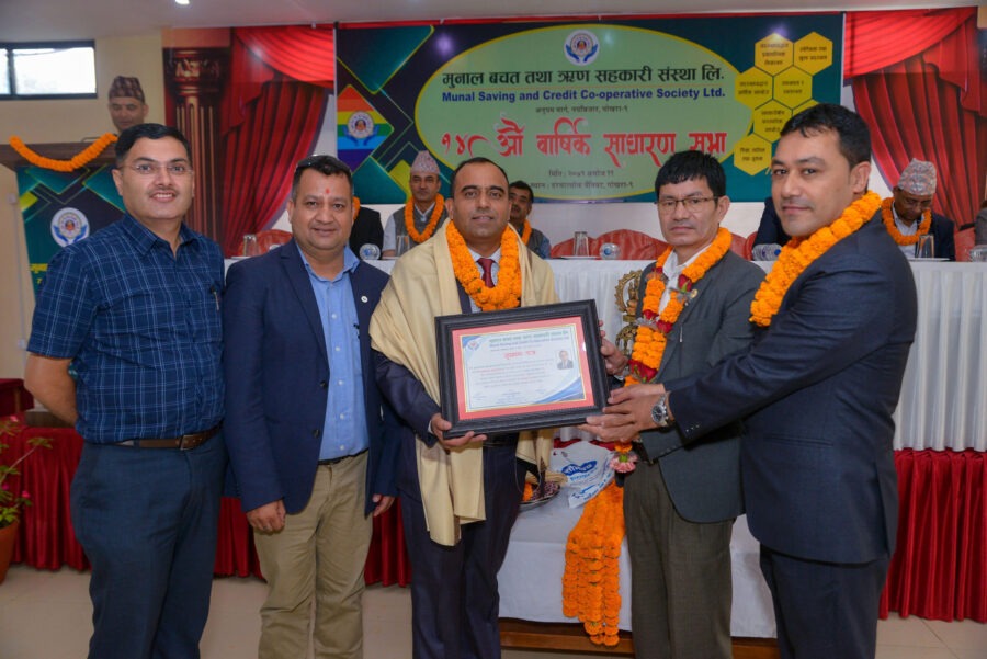 काठमाडौं । मुनाल सहकारी संस्थाका निवर्तमान अध्यक्ष दुर्गाप्रसाद हुमागाईं सम्मानित भएका छन् । मुनाल सहकारी संस्थाले वर्षभरि उत्कृष्ट कारोबार गरेको भन्दै हुमागाईंलाई सम्मान गरेको हो ।