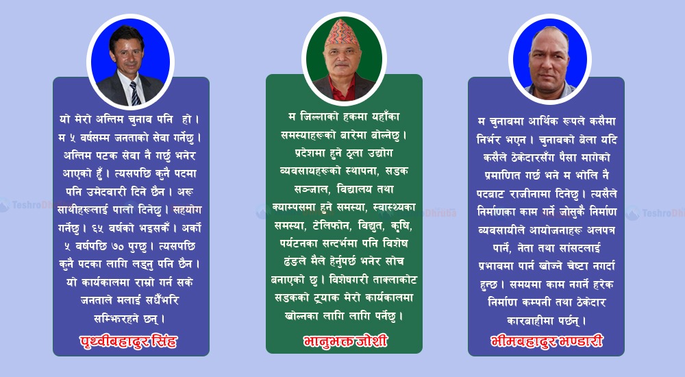 म नसक्ने काम बोल्दैन । चुनावको बेलामा पनि एक÷दुई ठाउँमा विद्यालयको नराम्रो अवस्था देखेर बेलेको छु, खाने पानीको समस्या भएको ठाउँमा बोलेको छु । बाँकीको ठाउँमा विश्वासको मत मागेको हुँ । मैले कुनै पनि ठाउँमा राजनीतिक रूपले आश्वासन दिएको छैन । राजनीतिक रूपमा सहयोग आदानप्रदान भएको भए काम गर्न असजिलो हुन्छ । मैले जनतालाई बिश्वासको मत दिनुहोस् म सके जति तपाईँको समस्या समाधान गर्नतिर लाग्छु भनेको छु । सकेजति इमान्दार ढंगले काम पनि गर्नेछु । नसके सकिन भन्छु तर, बेइमानी गर्दैन भनेको छु । त्यसैले मलाई पक्ष विपक्ष हुनु पनि पर्दैन ।