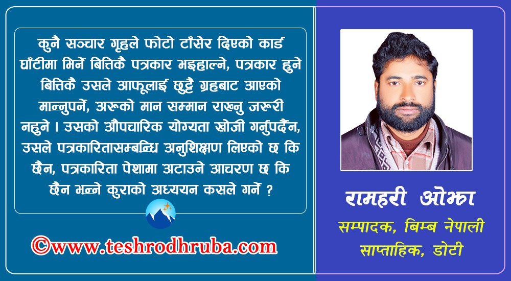 तर, पत्रकार हुनका लागि के हो मापदण्ड ? कुनै सञ्चार गृहले फोटो टाँसेर दिएको कार्ड घाँटीमा भिर्ने बित्तिकै पत्रकार भइहाल्ने, पत्रकार हुने बित्तिकै उसले आफूलाई छुट्टै ग्रहबाट आएको मान्नुपर्ने, अरूको मान सम्मान राख्नु जरूरी नहुने । उसको औपचारिक योग्यता कति हो भन्ने खोजी गर्नुपर्दैन, उसले पत्रकारितासम्बन्धि अनुशिक्षण लिएको छ कि छैन, पत्रकारिता पेशामा अटाउने आचरण छ कि छैन भन्ने कुराको अध्ययन कसले गर्ने ? आफू बिरुद्ध कुनै समाचार सम्प्रेषण भयो भने कुनै व्यापारीले अर्काको शैक्षिक योग्यताको प्रमाणपत्र मागेर पत्रिका दर्ता गराउँछ, सम्पादक हुनका लागि स्नातक उत्तीर्ण गरेको हुनुपर्ने जो व्यवस्था छ । अनि समाचार लेख्ने पत्रकारलाई अप्ठेरोमा पार्नका लागि आफ्ना हनुमानहरूलाई ‘पत्रकार’ को परिचय पत्र उपलब्ध गराउँछ । ति ‘पत्रकार’ को योग्यता क्षमता केही हेरिदैन । अनि त्यस्ता व्यक्तिले गरेको पत्रकारिता के ‘मर्यादित हुन सक्ला र ?’