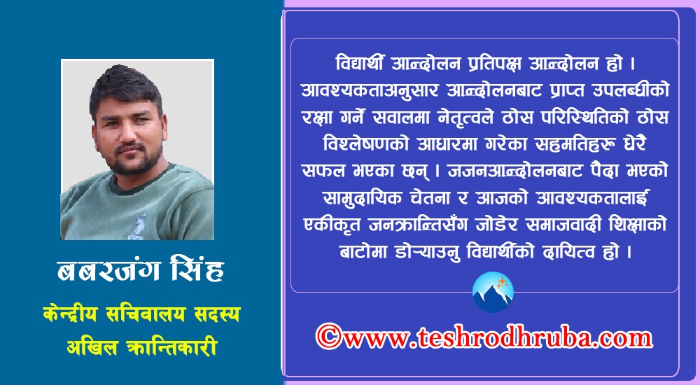सचेत युवा विद्यार्थी र विद्यार्थी संगठनको कर्तब्य विद्यालय, विश्वविद्यालयको बिसंगतिबिरुद्ध संघर्ष गर्दै आफ्नो समाजको बिकृति हटाउन पनि भूमिका निर्वाह गर्नु हो । मुलकको असमान शिक्षालाई समान र गुणस्तरयुक्त निःशुल्क माटो सुहाउँदो व्यवहारिक सर्वसुलभ शिक्षाको नीतिलाई कार्यान्वयन गर्ने जुझारू नेतृत्व आजको आवश्यकता हो । सिर्जनशील र रचनात्मक नेता विभिन्न विद्यार्थी संगठनले चाहेका छन् ।