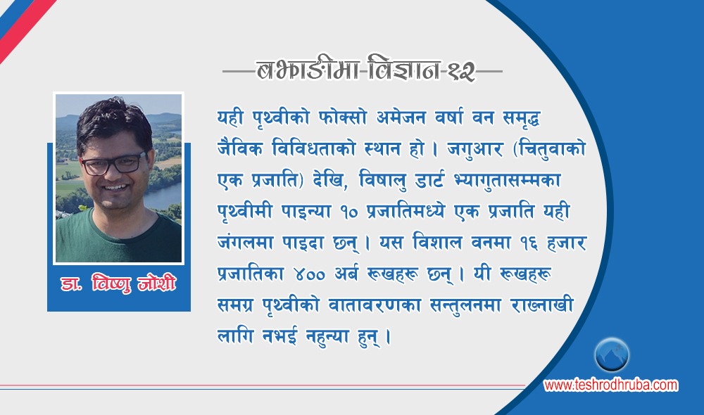 यही पृथ्वीको फोक्सो अमेजन वर्षा वन विनासका लागि मानव जन्य कारणहरूको बारेमा चर्चा अरौँ अब । अमेजन वर्षा वन समृद्ध जैविक विविधताको स्थान हो । जगुआर (चितुवाको एक प्रजाति) देखि, विषालु डार्ट भ्यागुतासम्मका पृथ्वीमी पाइन्या १० प्रजातिमध्ये एक प्रजाति यही जंगलमा पाइदाछन् । यस विशाल वनमा १६ हजार प्रजातिका ४०० अर्ब रूखहरू छन् । यी रूखहरू समग्र पृथ्वीको वातावरणका सन्तुलनमा राख्नाखी लागि नभइनहुन्या हुन् ।