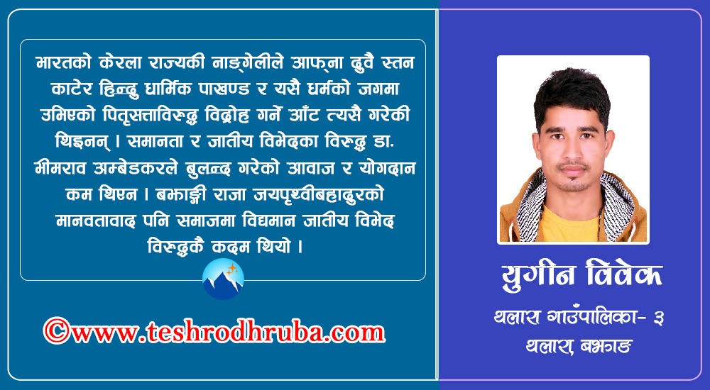 भारतको केरला राज्यकी नाङ्गेली नामक महिलाले आफ्ना दुवै स्तन काटेर हिन्दु धार्मिक पाखण्ड, र यसै धर्मको जगमा उभिएको पितृसत्ताका विरुद्ध विद्रोह गर्ने आँट त्यसै गरेकी थिइनन् । समानता र जातीय विभेदका विरुद्ध डा. भीमराव अम्बेडकरले बुलन्द गरेको आवाज र योगदान कम थिएन । बझाङ्गी राजा जयपृथ्वीबहादुर सिँहको मानवतावाद पनि समाजमा विद्यमान जातीय विभेद विरुद्धकै एउटा कदम थियो भन्न सकिन्छ । लामो कालखण्ड जातीय विभेदको आफरमा आफूलाई जोत्दै आएको यो समुदाय हिजोआज अशिक्षा, बेरोजगारी, गरिबी, भूमिहीनता जस्ता जटिलतासंग जुध्दैछ । अझ त्योभन्दा भीषण समस्या त जातीय विभेदजन्य कारणले हुने कठोर मानसिक यातनाबाट गुज्रिएर सकसपूर्ण जीवन जिउनु परेको तीतो यथार्थ हाम्रो सामु उभिएको छ ।