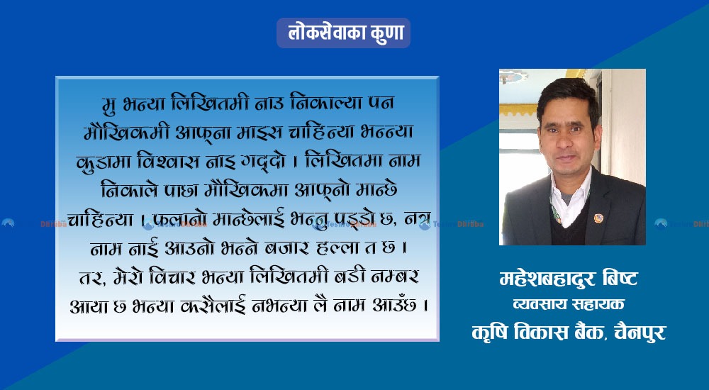 – मु भन्या यो कुडामा त्यति विश्वास नाइ गद्दो । लिखितमा नाम निकाले पाछा मौखिकमा आफ्नो मान्छे चाहिन्या । फलानो मान्छेलाई भन्नु पड्डो छ, नत्र नाम नाई आउनो भन्ने बजार हल्ला त छ । तर, मेरो विचार भन्या लिखितमी बडी नम्बर आया छ भन्या कसैलाई नभन्या लै नाम आउँछ । हरेक वर्ष लोकसेवा आयोगबाट धेरै संख्यामा गरिब, केही पनि पहुँच नभएका मान्छेले जागिर खाएकै हुना छन् । सार्वजनिक संस्थान, सुरक्षा निकायतिरको लिखितपछिको मौखिक परीक्षा पन लोकसेवा आयोगले लिया अझ राउणो हुन्याथो भन्न्या मेरो बुझाई छ ।