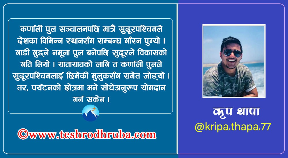 पुल सञ्चालनपछि मात्रै सुदूरपश्चिमले कर्णाली पारी हुँदै देशका विभिन्न स्थानसँग सम्बन्ध गाँस्न पुग्यो । कर्णालीमा गाडी गुड्ने देशकै नमूना पुल बनेपछि सुदूरले विकासको गति लियो । यातायातको लागि त कर्णाली पुलले सुदूरपश्चिमलाई मुलुकभर नै जोड्यो । तर, पर्यटनको क्षेत्रमा भने सोचेअनुरूप योगदान गर्न सकेको छैन ।