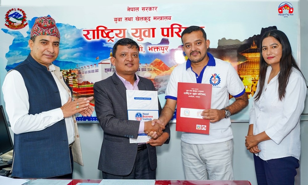 काठमाडौं । नेपाल सरकार, राष्ट्रिय युवा परिषद् र नेपाल बिजनेस इन्स्टिच्युट (एनबीआई) को संयुक्त आयोजनामा यहि भाद्र ८ गते काठमाडौँमा नेपाल युवा उद्यमशीलता शिखर सम्मेलनको तेस्रो संस्करण आयोजना हुने भएको छ । सम्मेलन आयोजनासम्बन्धि समझदारी पत्रमा बुधबार राष्ट्रिय युवा परिषद्का कार्यकारी उपाध्यक्ष सुरेन्द्र बस्नेत र नेपाल बिजनेस इन्सिच्युटका कार्यकारी अध्यक्ष विशाल गैरेले संयुक्त रुपमा हस्ताक्षर गरेका छन् ।