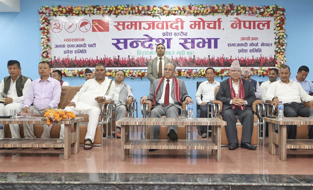 मोरङ । समाजवादी मोर्चाका नेताहरूले मुलुकको संकट समाधान, स्थिरता र असमानता अन्त्य गर्न मोर्चा निर्माण भएको दाबी गरेका छन्। आज विराटनगरमा आयोजित सन्देश सभालाई सम्बोधन गर्दै जनता समाजवादी पार्टीका नेता उपेन्द्र यादवले मोर्चा कसैको विरूद्ध नभई मुलुकको निकासका लागि बनाइएको बताए।