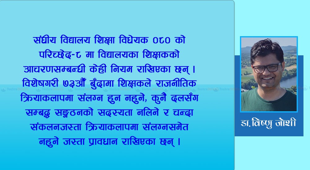 संघीय विद्यालय शिक्षा विधेयक,२०८० को परिच्छेद-८ मा विद्यालयका शिक्षकको आचरणसम्बन्धी केही नियम राखिएका छन् । विशेष गरी ७३ औँ बुँदामा शिक्षकले राजनीतिक क्रियाकलापमा संलग्न हनु नहुने, कुनै दलसँग सम्बद्ध सङ्गठनको सदस्यता नलिने र चन्दा संकलनजस्ता क्रियाकलापमा संलग्न समेत नहुने जस्ता प्रावधान राखिएका छन् । तर आज शिक्षा मन्त्रालय शैक्षिक नीति निर्माण र तिनको कार्यसम्पादन, निरीक्षण गर्ने उच्च पदहरूदेखि गाउँ गाउँका विद्यालय व्यवस्थापन समिति विभिन्न दलका कार्यकर्ता भर्ती केन्द्र भएका छन् । तसर्थ ऐन कानुन बनाउनुसँगै तिनको पालनामा सबै सरोकार बालाहरूको सक्रिय र ईमान्दार सहभागिता चाहिन्छ । अभिभावक र विद्यार्थी सबैले सजग रहनुपर्छ ।