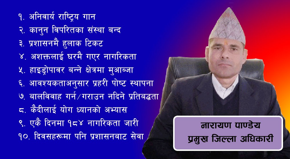 त्यस्तै प्रशासनमा कार्यालय समय १० बजे अगाडि अनिवार्य राष्ट्रिय गान गाएर मात्रै सेवा सुचारू गर्ने कामको थालनी पाण्डेयले गरेका छन् । त्यस्तै कानुन विपरित चल्ने संघ संस्था÷व्यवसाय तुरून्द बन्द गर्ने अभियान चलाएपछि जिल्लामा सबै संघ संस्था तथा व्यापारीहरू कानुनको दायरामा आएको पाण्डेयको कार्य सम्पादनको विवरणमा उल्लेख छ ।