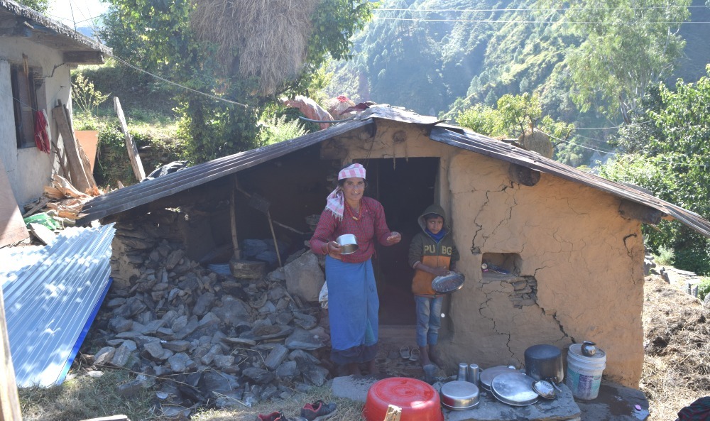 बझाङ । गत असोज १६ गते आएको भूकम्पले खप्तडछान्ना–५ पिठातोलाकी अम्भिकादेवी जोशीको घर पूर्ण रूपमा क्षति भयो । घरमा बस्ने अवस्था रहेन । लगातार पराकम्प आउन थालेपछि उनको परिवार हप्ता दिनसम्मै अस्थायी छानो (गाउँबाट टाढा बस्तुभाउका लागि बनाएको घर/गोठ) मा बस्न थाल्यो ।