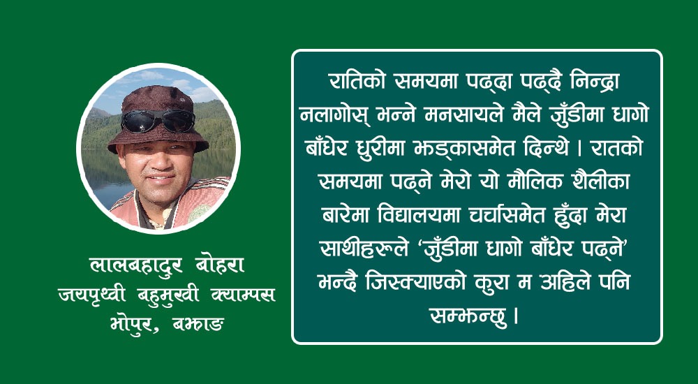विद्यालय जाँदा आउँदासमेत किताब वा नोट पढ्न कहिल्यै छोडिन । त्यति मात्र होइन, रातिको समयमा पढ्दा पढ्दै निन्द्रा नलागोस् भन्ने मनसायले मैले जुँडीमा धागो बाँधेर धुरीमा झड्कासमेत दिन्थे । रातको समयमा पढ्ने मेरो यो मौलिक शैलीका बारेमा विद्यालयमा चर्चासमेत हुँदा मेरा साथीहरूले ‘जुँडीमा धागो बाँधेर पढ्ने’ भन्दै जिस्क्याएको कुरा म अहिले पनि सम्झन्छु । तथापि, मैले एल.एल.सी. परीक्षा समापन नहुन्जेल त्यो प्रयास जारी नै राखे ।