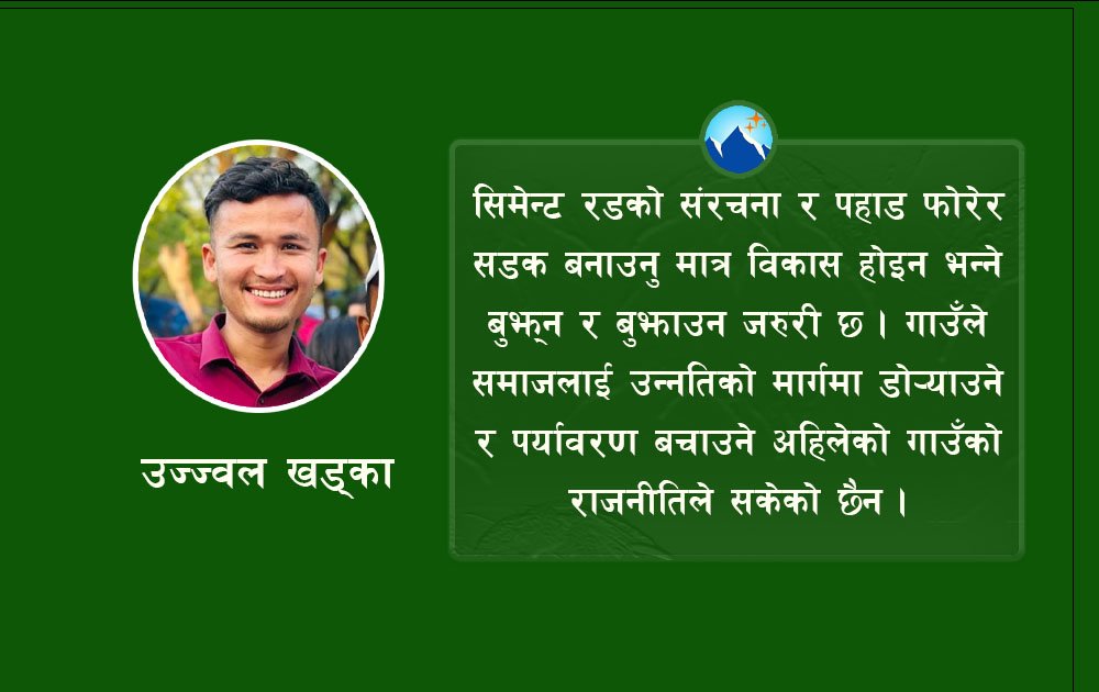 सिमेन्ट रडको संरचना र पहाड फोरेर सडक बनाउनु मात्र विकास होइन भन्ने बुझ्न र बुझाउन जरुरी छ । गाउँले समाजलाई उन्नतिको मार्गमा डो¥याउने र पर्यावरण बचाउने अहिलेको गाउँको राजनीतिले सकेको छैन । योजना र इच्छाशक्ति भएमा अहिले भइरहेकै बजेट र साधन स्रोतले धेरै काम गर्न सकिन्छ ।