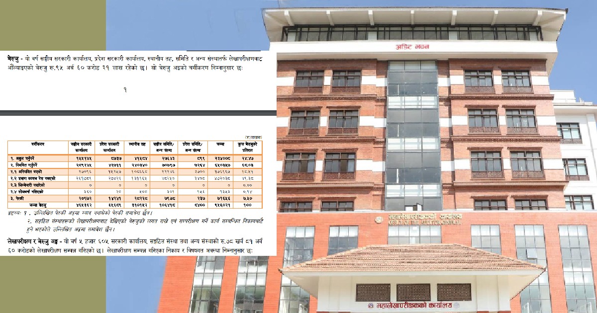 संघीय मन्त्रालय तथा निकाय मातहतका तीन हजार २७७ कार्यालयको २४ खर्ब ६१ अर्ब ११ करोड, प्रदेश मन्त्रालय तथा निकाय मातहतका एक हजार २७० कार्यालयको ३ खर्ब २३ अर्ब ३४ करोड र ७४६ वटा स्थानीय तहको ११ खर्ब ३९ अर्ब १९ करोड रुपैयाँबराबरको लेखापरीक्षण गरिएको महालेखापरीक्षकको प्रतिवेदनमा उल्लेख छ ।