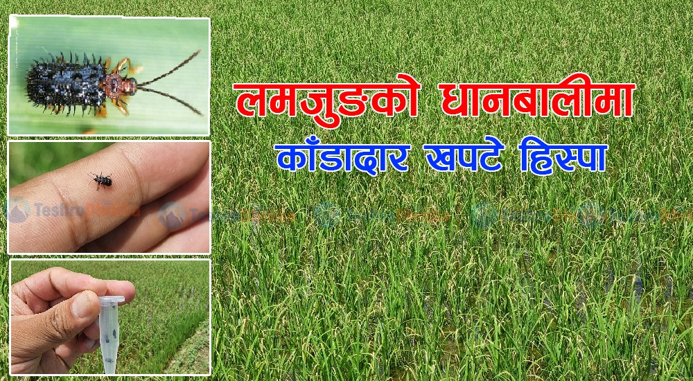 काठमाडौँ । लमजुङको धानबालीमा ‘काँडादार खपटे हिस्पा’ नामक किरा देखिन थालेको छ । जिल्लाको राइनास नगरपालिका, सुन्दरबजार नगरपालिका, मध्यनेपाल नगरपालिका र बेसिसहर नगरपालिकाका विभिन्न स्थानमा काँडादार खपटे हिस्पा नामक किरा देखिन थालेको हो ।