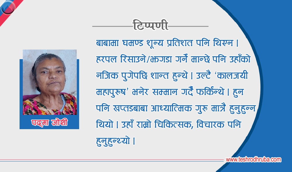 अहिलेका शल्यक्रिया गर्नेलाई डाक्टर भन्छन् भने त्यो बेलामा बाबाले शल्यक्रिया गर्ने नपर्ने गरी ‘काल’ को ‘शत्रु’ बनेर खडा भइदिनुहुन्थ्यो । आज बाबाकै कारणले खप्तडको ख्याति, सम्मान, इज्जत र लोकप्रियता बढेको छ । त्यसैले उहाँ खप्तडका लागि भूषण नै बन्नुभयो ।