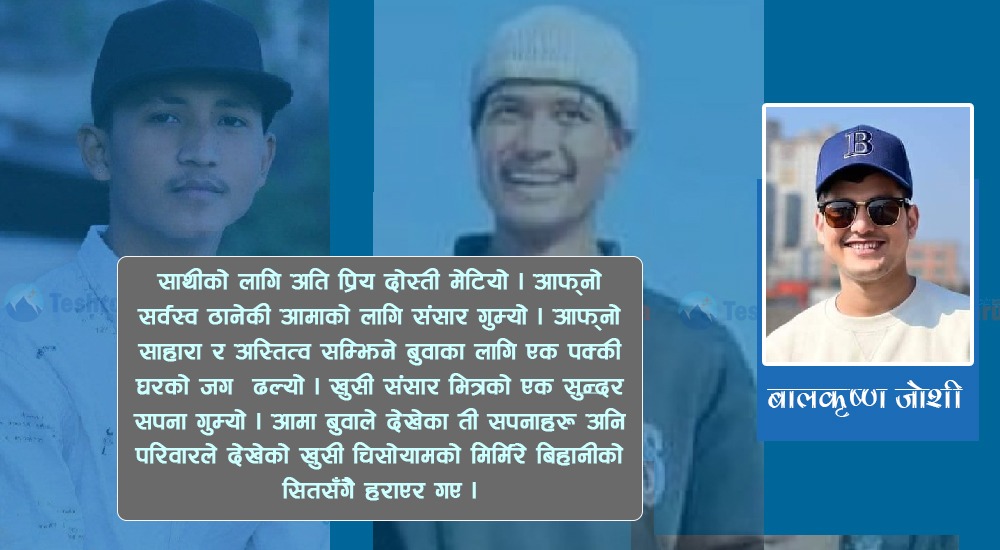हावाको बेगसँगै तिमीहरू आफ्नो गति बढाउ । अनि तातो गोलीको रफ्तारलाई उछिनेरै भए पनि आफ्नो परिवारको सपना तुहिन नदेउ है । अझै तिमीप्रति न्याय खोजिरहेका परिवारलाई निरासाको बाटोमा नधकेल्नु । सपनामा आएर पनि परिवारलाई उठ्ने ढाडस दिनु….।