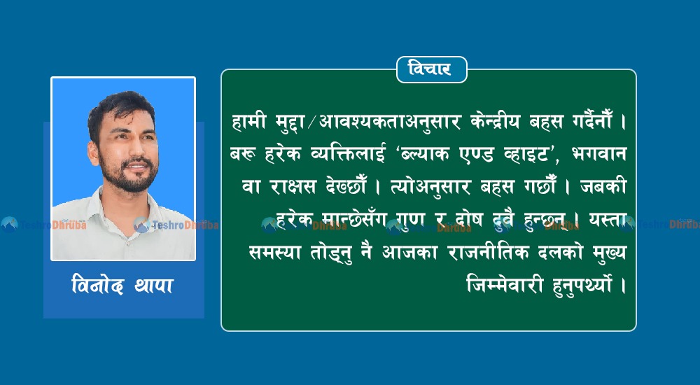हामी मुद्दा/प्रवृत्ति केन्द्रिय बहस गर्दैनौ । बरु हरेक व्यक्तिलाई ‘ब्ल्याक एण्ड व्हाइट’/ भगवान वा राक्षस देख्छौ । जबकी हरेक मान्छे संग गुण र दोष दुवै हुन्छन् । यस्ता समस्या तोड्नु नै आजका राजनीतिक दलको मुख्य जिम्मेवारी हुनुपर्छ। जसमा पुराना नयाँ दलहरु असफल भैरहेका छन् , यी दलहरु असफल हुनु भनेको राजनीतिमा योग्य व्यक्ति आउने बाटो बन्द हुनु हो वा योग्य व्यक्तिले पनि विकेकले भन्दा भावना र पैसाले काम गर्न बाध्य हुनु हो । जसका लागि भ्रष्टाचार र झुट अनिवार्य हुन्छ । जब यो दल दलमा योग्य व्यक्ति फस्छ त्यो पनि अयोग्य नै भएर निस्कन्छ ।
