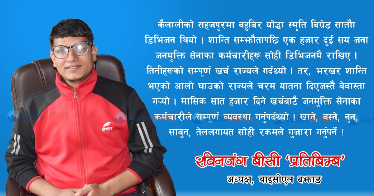 कैलालीको सहजपुरमा बहुबिर योद्धा स्मृति बिग्रेड सातौँ डिभिजन थियो । शान्ति सम्झौतापछि एक हजार दुई सय जना जनमुक्ति सेनाका कर्मचारीहरू सोही डिभिजनमै राखिए । तिनीहरूको सम्पूर्ण खर्च राज्यले गर्दथ्यो । तर, भरखर शान्ति भएको आलो घाउको राज्यले चरम यातना दिएजस्तै बेवास्ता ग¥यो । मासिक सात हजार दिने खर्चबाटै जनमुक्ति सेनाका कर्मचारीले सम्पूर्ण व्यवस्था गर्नुपर्दथ्यो । खाने, बस्ने, नुन, साबुन, तेललगायत सोही रकमले गुजारा गर्नुपर्ने !