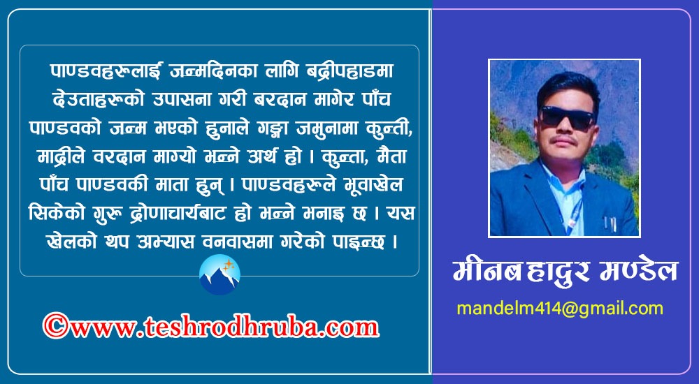 पाण्डवहरूलाई जन्मदिनका लागि वद्रीपहाडमा देउताहरूको उपासना गरि, बरदान मागेर पाँच पाण्डवको जन्म भएको हुनाले गङ्गा जमुनामा कुन्ती, माद्रीले वरदान माग्यो भन्ने अर्थ हो । कुन्ता, मैता पाँच पाण्डवकी माता हुन् । पाणडवहरूले भूवाखेल सिकेको गुरु द्रोणाचार्यबाट हो भन्ने भनाइ छ । यस खेलको थप अभ्यास वनवासमा गरेको पाइन्छ । काैरव-पाण्डवहरूको लडाइँ सकिएपछि पाण्डवहरूले विजयको खुशीमा फेरि एकपटक यो खेल कुरुक्षेत्रको मैदानमा खेलेको देखिन्छ ।