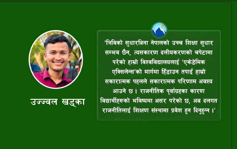 काठमाडौँ । त्रिभुवन विश्वविद्यालय केन्द्रीय क्याम्पसमा हुने स्ववियु निर्वाचनमा सभापति पदका लागि राजनीतिशास्त्रका विद्यार्थी उज्ज्वल खड्काले स्वतन्त्र रूपमा उम्मेदवारी दिने घोषणा गरेका छन् । आगामी चैत्र ५ गते हुने स्ववियु निर्वाचनका लागि राजनीतिक पूर्वाग्रहभन्दा बाहिर रही विद्यार्थी मुद्दाहरूमा केन्द्रित रहेर काम गर्ने उद्देश्यले खड्काले उम्मेदवारी दिन लागेका हुन् ।