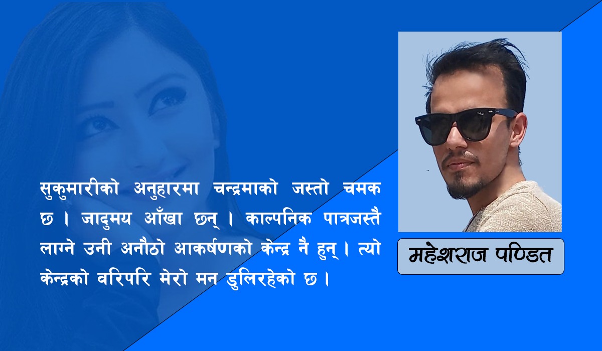 अनुहारमा चन्द्रमाको जस्तो चमक, जादुमय आँखा, बहुरूपी, काल्पनीक पात्रजस्तै लाग्ने । सुकुमारीतर्फको पहिलो नजरले नै लक्ष्यबाट डाइभर्ट गराइदियो । कालो कपाल, उज्यालो अनुहार, हल्का गुलाबी लिपस्टिक, सेतो कुर्ता । उनलाई एक झलक हेर्दा नै मेरो मुटुको गति बढ्यो । म त परीक्षा पास गर्न आएको थिएँ । तर, परीक्षाका प्रश्नभन्दा कठिन प्रश्न उनका आँखामा देखिन थाले । सुकुमारी चुपचाप आफ्नो कलम सुम्सुम्याउँदै, सायद, अन्तिम मिनेटको रिभिजन गर्दै थिइन् । तर, मेरो मनमा चाहिँ परीक्षा गडबड हुने संकेत आउन थालिसक्यो ।
