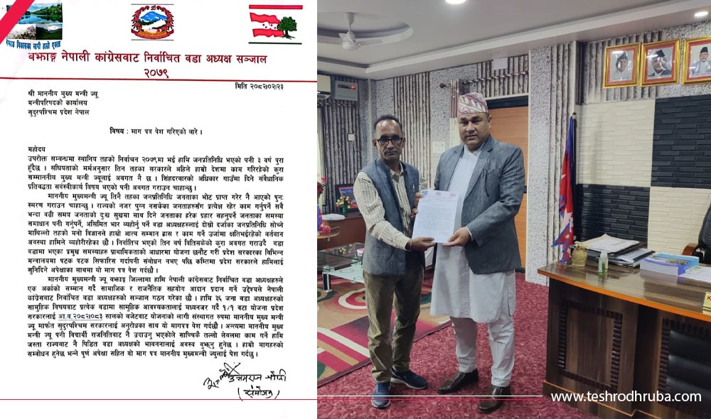 बझाङ । नेपाली कांग्रेस बझाङबाट निर्वाचित वडाध्यक्षहरूको सञ्जालले सुदूरपश्चिमका मुख्यमन्त्री कमलबहादुर शाहलाई योजनाहरू समेट्न मागपत्र पेश गरेका छन् । निर्वाचित भएको तीन वर्षसम्म पनि प्रदेश सरकारले आफ्नो वडाहरूमा योजना नसमेटिएको भन्दै वडाध्यक्ष सञ्जालले मागपत्र पेश गरेको हो ।