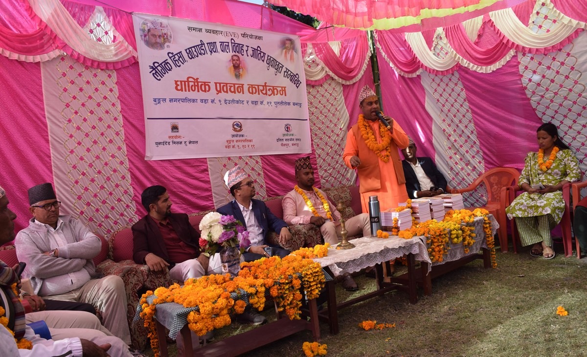 शुक्रबारदेखि बुंगल नगरपालिका वडा नं ६, ७, ९, १० र ११ मा कुरिती अन्धविश्वासको विरुद्धमा कुरिती अन्धविश्वासको विरुद्धमा हिन्दु धर्म गुरू संस्कार शिरोमणी ज्योतिषाचार्य पण्डित गणेशप्रसाद पन्त पञ्चांगकार र बैदिक पुरोहित सुरेश सनातनी आर्यले धार्मिक प्रवचन दिन थालेका हुन् ।