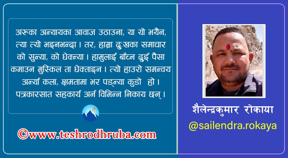 – मुईले पत्रकारिता सुरु अ्र्याको झण्डै २० वर्ष हुन लाइगयो । यी वर्षमा मुइले पन झिक्कै धम्की र कुट्न्या, लड्न्या भन्या कुणा आउनु झिक्कै सह्या । खबरपात लेख्याकै कारण कन्नेईपन पत्रकारलाई धम्की दिनु भन्याको यो अमानवीय र असोभनीय कुडा हो । यदी पत्रकारले पन काई कसुई व्यक्तिको प्रभावमा पणी, राजनीति आस्था राखी आधारमा बिभेद अरी समाचार लेख्याको छ भन्या पनि यैका लागि पन कानुनी अड्डा छन् । प्रेस काउन्सिल छ । त्या प झानु पड्यो । मान्छे मार्छु काट्छु भन्न पाइदैन् । तर हामे पत्रकारले पन समाचार सत्य तथ्य भइकन सबै पक्षका भनाई राखी समाचारलाई सत्यापन अरि समाचार छाप्नु पड्यो । पत्रकारिताको धर्म क्या हो । अचारसंहिता क्या हो भनी बुझ्नु पन पड्यो । पुलिस, प्रसासन, अड्डा, अदालत छनाइछन् । बेथितिका बिरुद्घ लेख्या काम छाण्नु हुँनैन ।